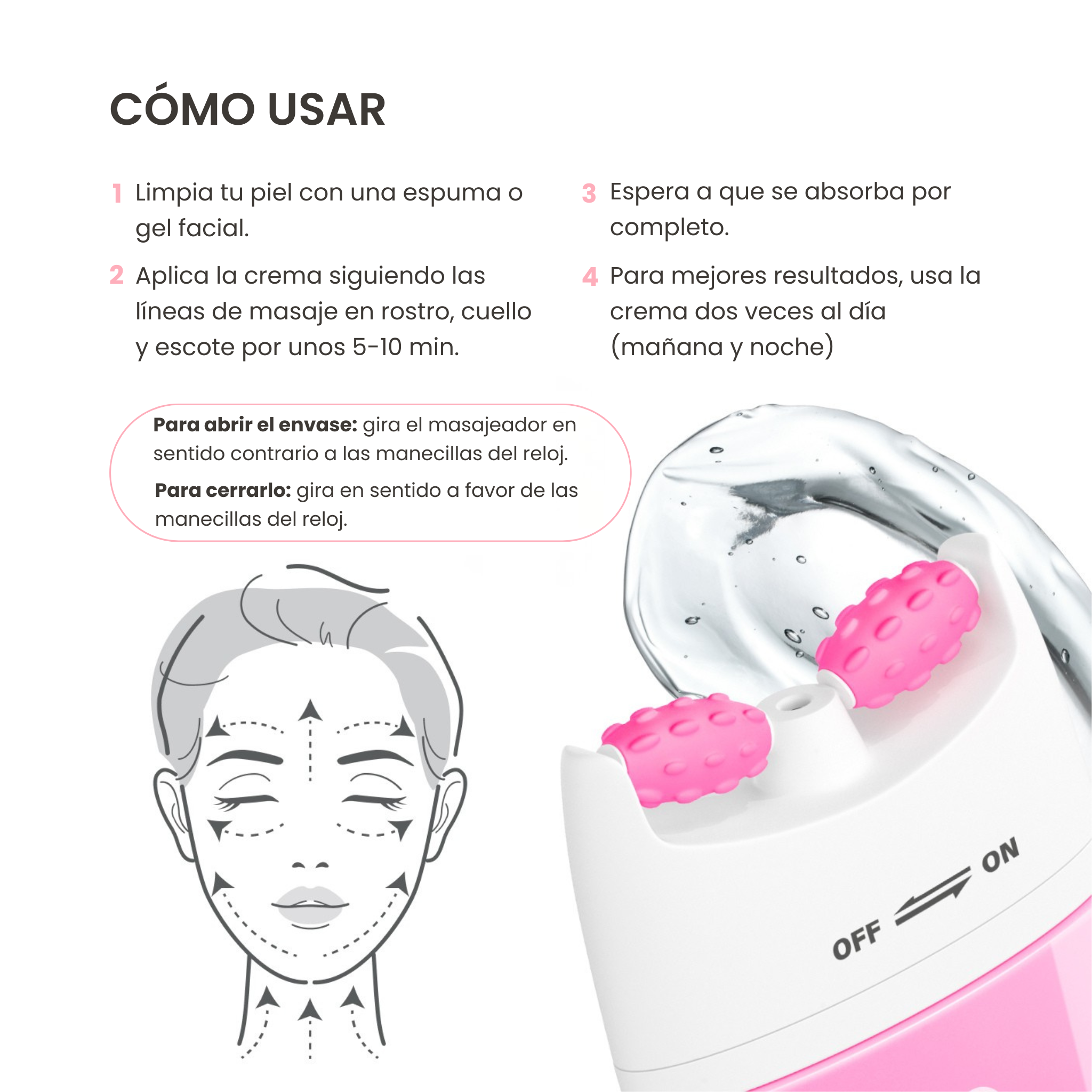 Rodillo 3D · Tonifica músculos faciales, mejora turgor y microcirculación, define contorno y reduce hinchazón.