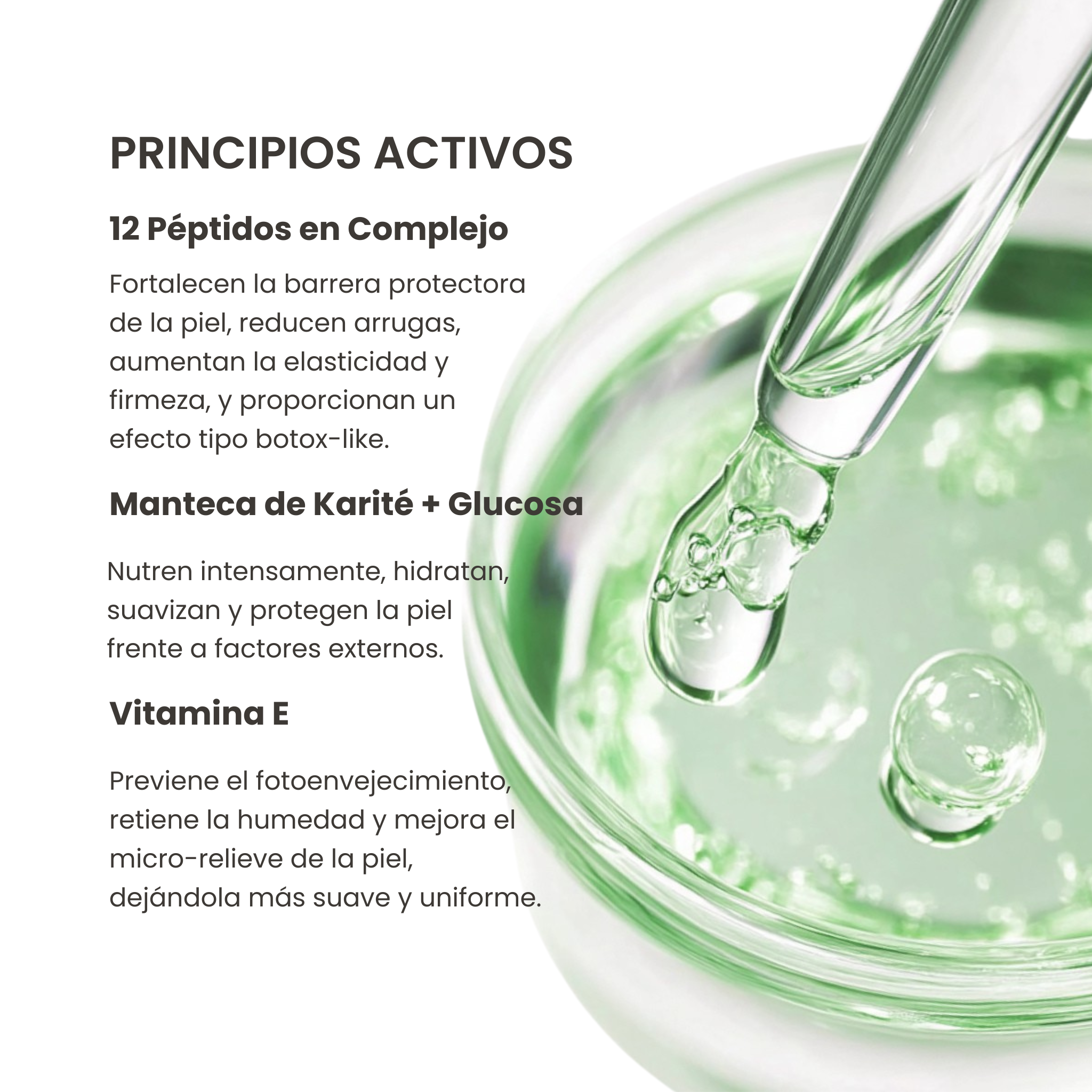 12 Péptidos en Complejo · Fortalecen la barrera cutánea, reducen arrugas y mejoran firmeza y elasticidad con un efecto botox-like suave.