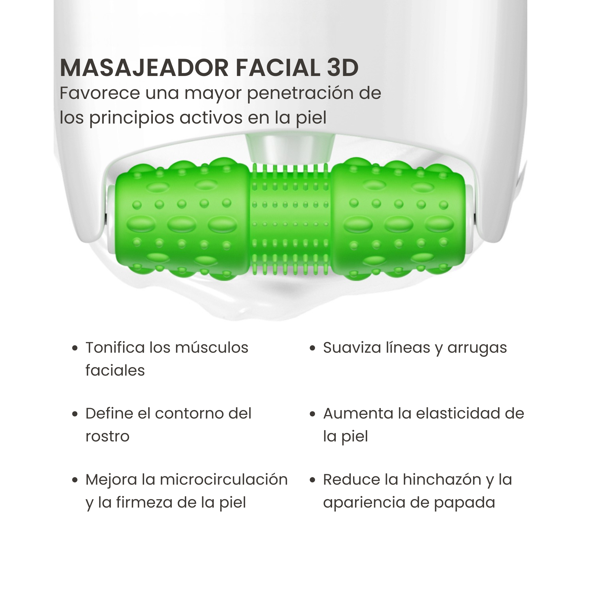 Rodillo 3D · Tonifica músculos faciales, estimula microcirculación, define el contorno y reduce hinchazón.