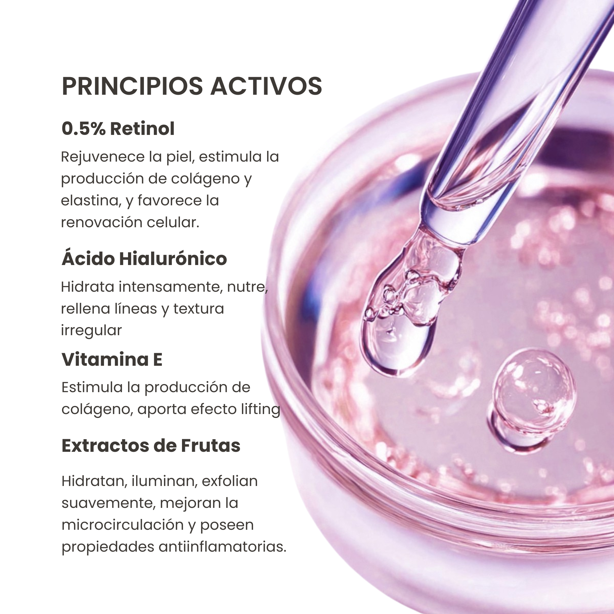0.5% Retinol · Rejuvenece la piel, estimula la producción de colágeno y elastina, mejora textura y acelera la renovación celular.