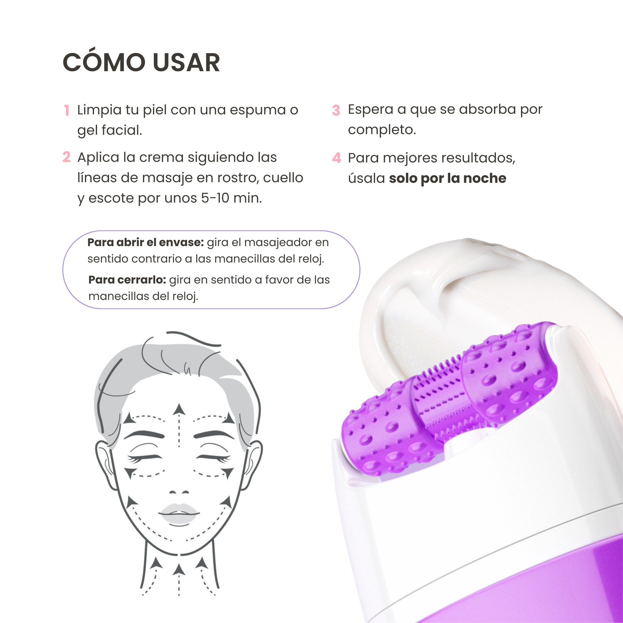 Aplicar una capa fina sobre rostro seco.