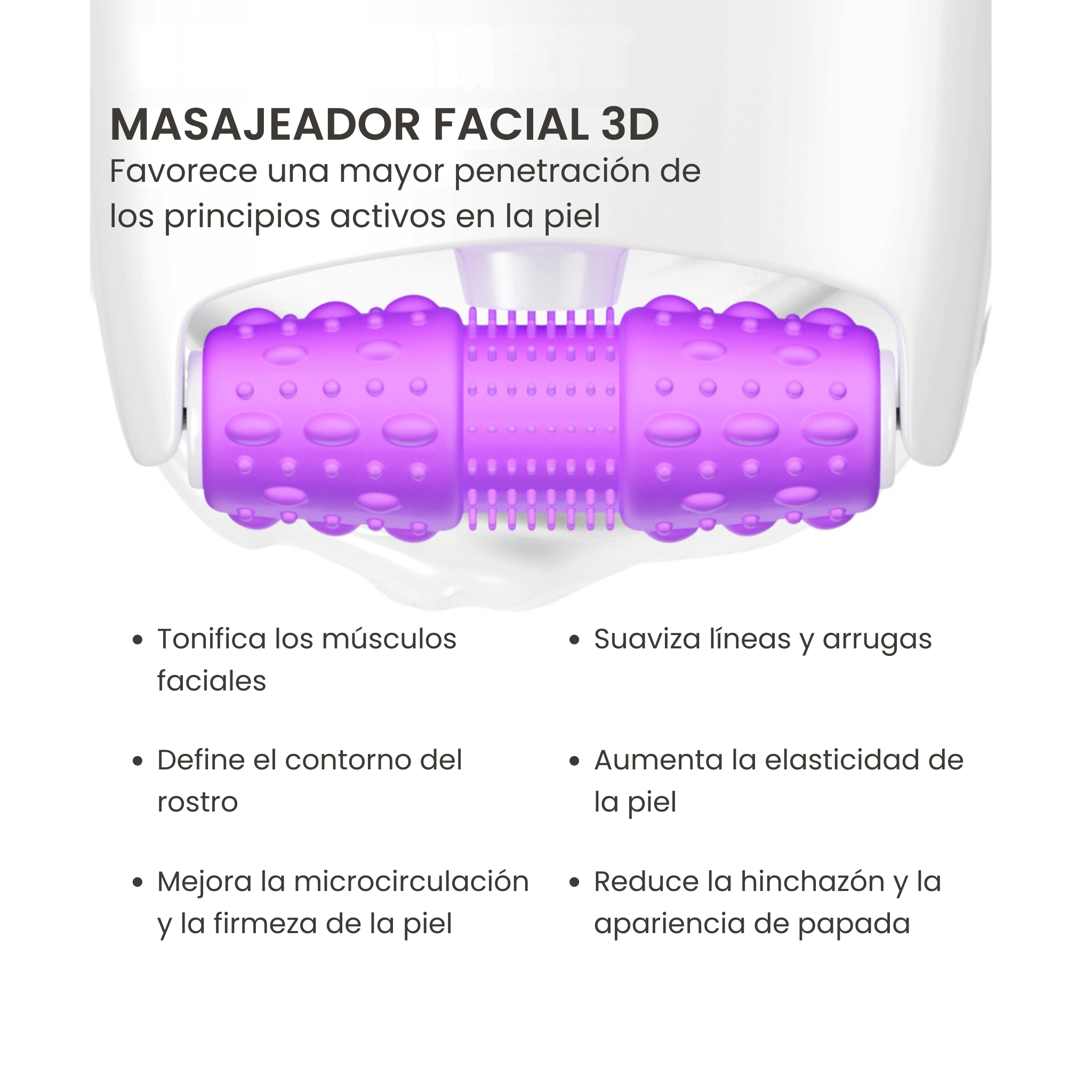 Rodillo 3D · Tonifica músculos faciales, define contorno, suaviza arrugas y mejora la elasticidad.