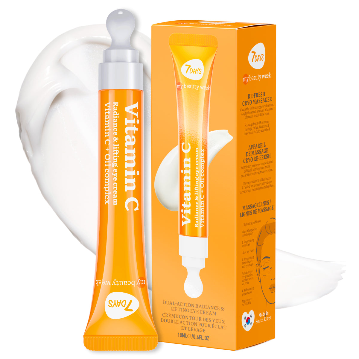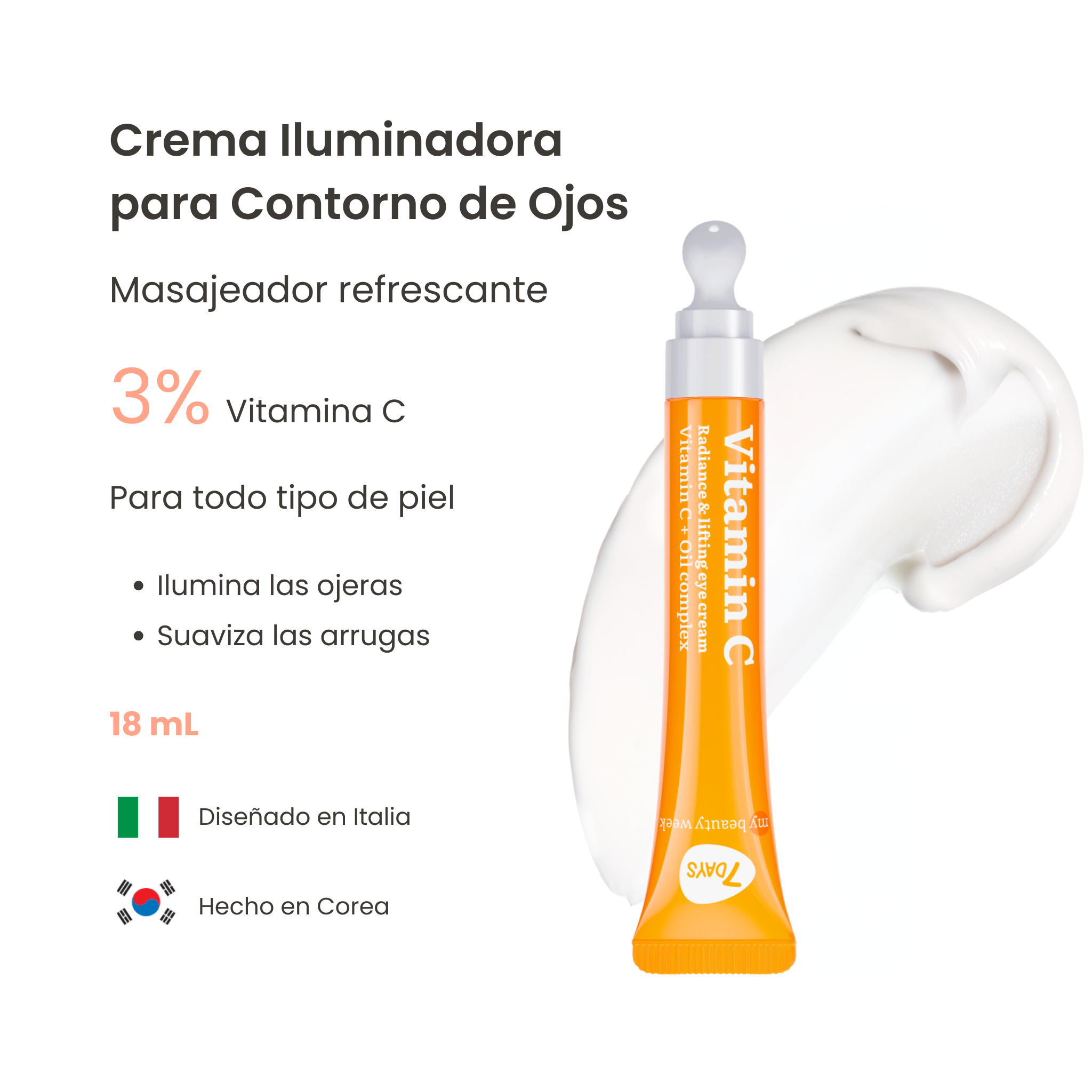 La Crema para Contorno de Ojos con Vitamina C 3% de 7DAYS combina un potente complejo iluminador con un masajeador cryo cerámico que refresca, desinflama y mejora la absorción de los principios activos. Está diseñada para aclarar ojeras, iluminar la mirada, suavizar líneas finas y mejorar la elasticidad, dejando una apariencia más fresca, firme y uniforme desde las primeras aplicaciones.