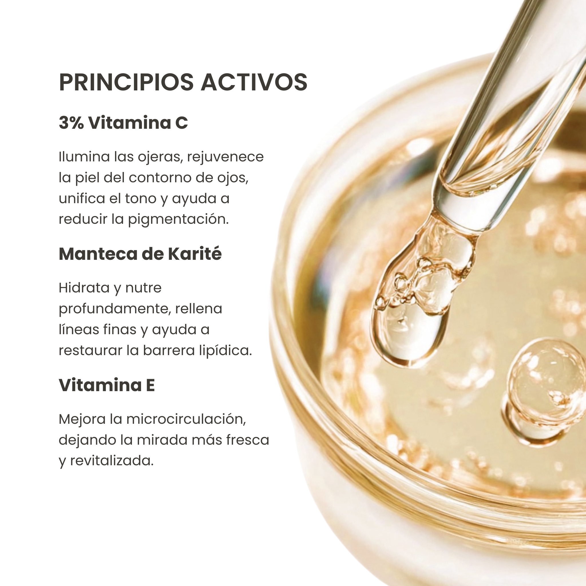 3% Vitamina C · Ilumina ojeras, unifica el tono, aporta luminosidad y estimula la producción de colágeno y elastina.